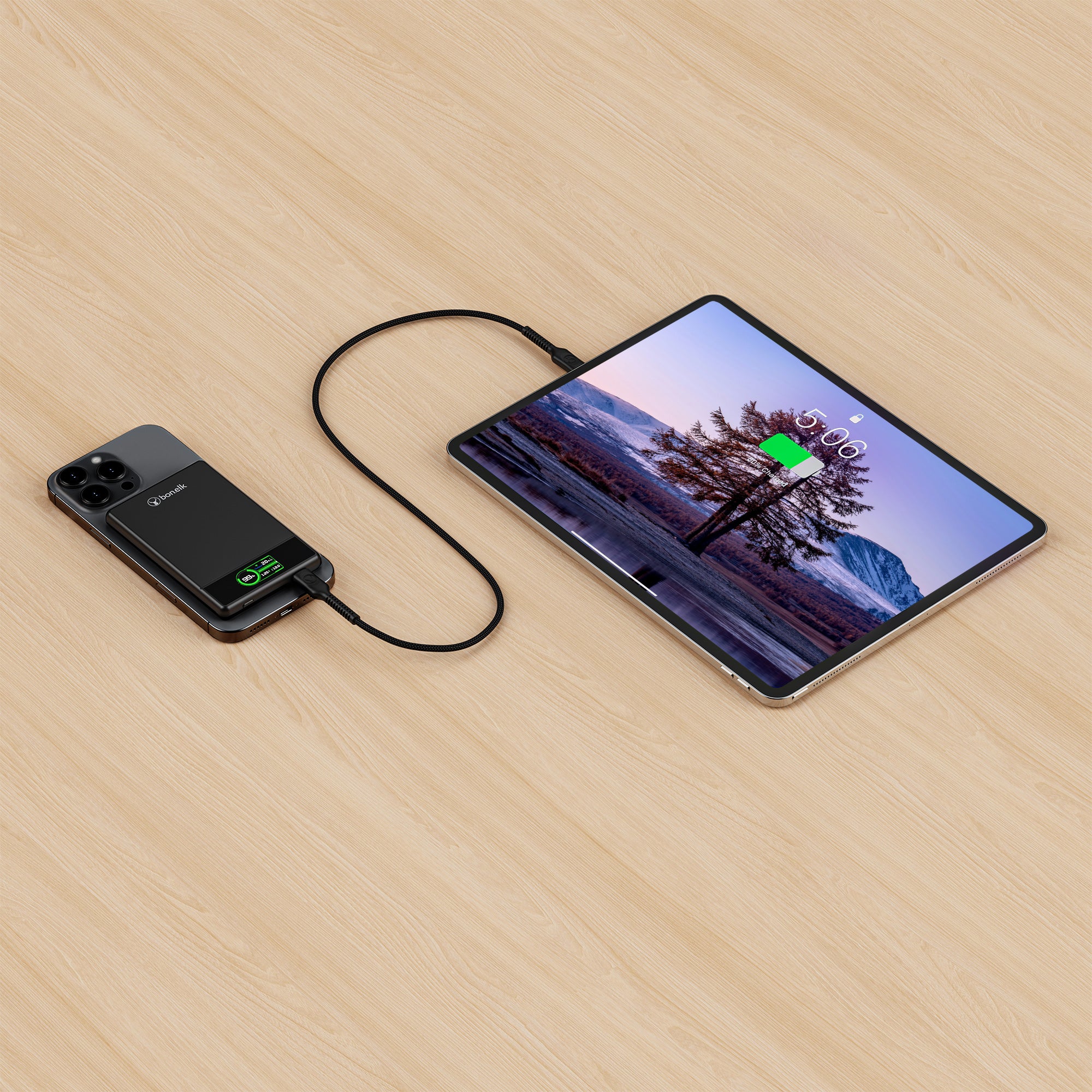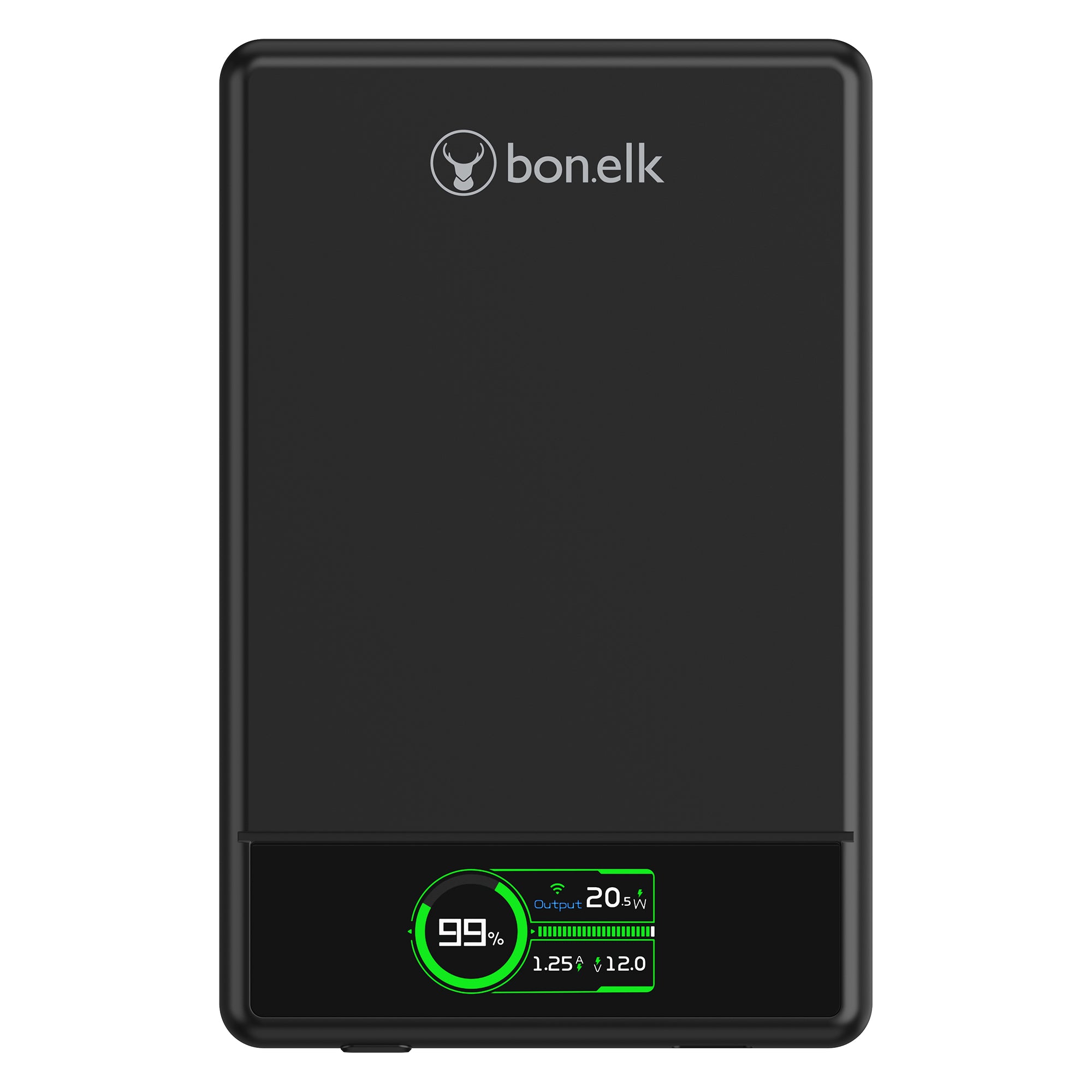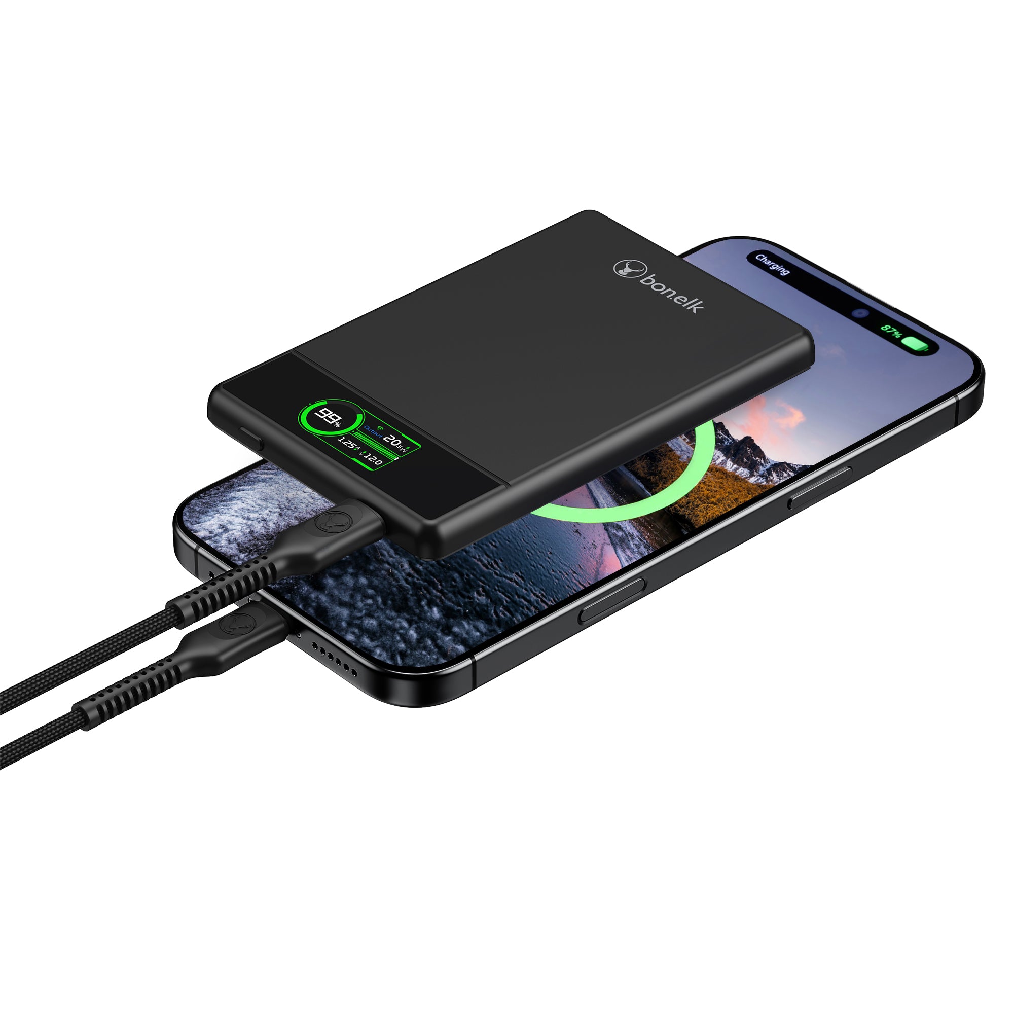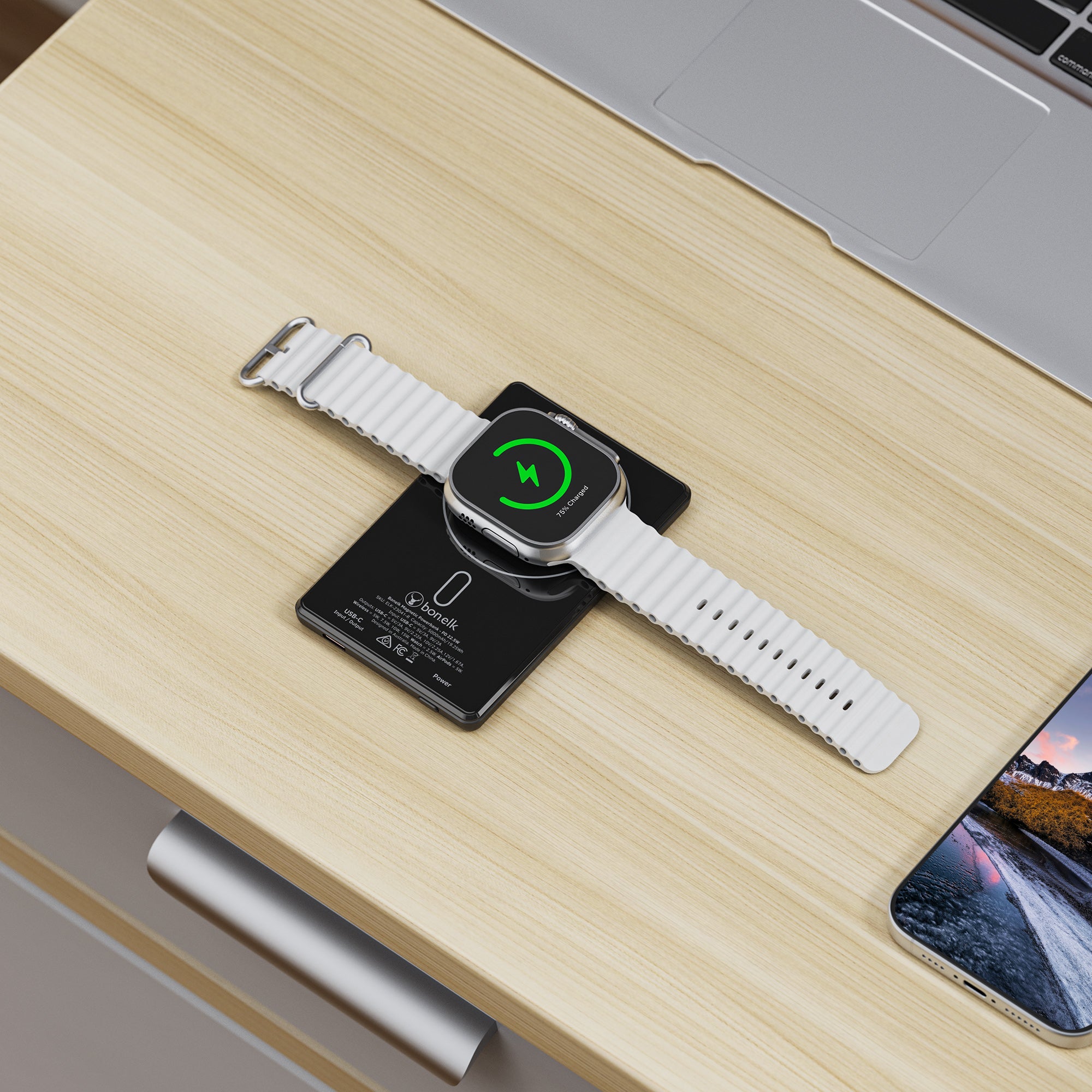 The Bonelk 4-in-1 Magnetic Power Bank delivers portable power with a 5,000 mAh capacity, allowing you to fast charge your iPhone*, Apple Watch, and AirPods anytime, anywhere. Its smart display clearly shows the exact power level and output capacity, while the strong magnetic attachment ensures your devices stay connected for hassle-free charging. Enjoy the convenience of wireless charging, with the added option to charge via the USB-C port using the included USB-C cable.
