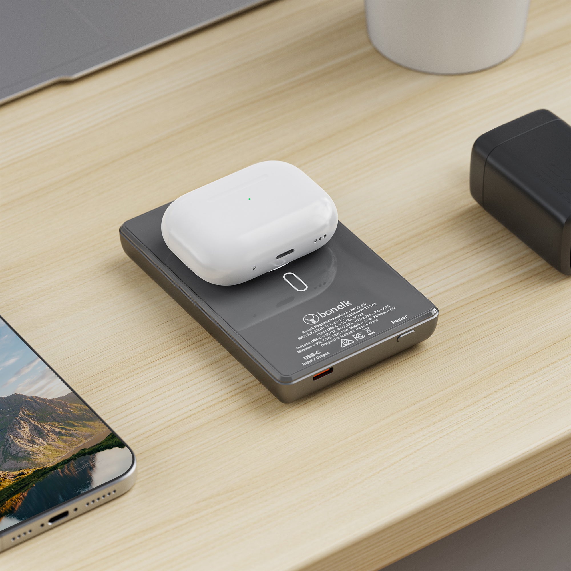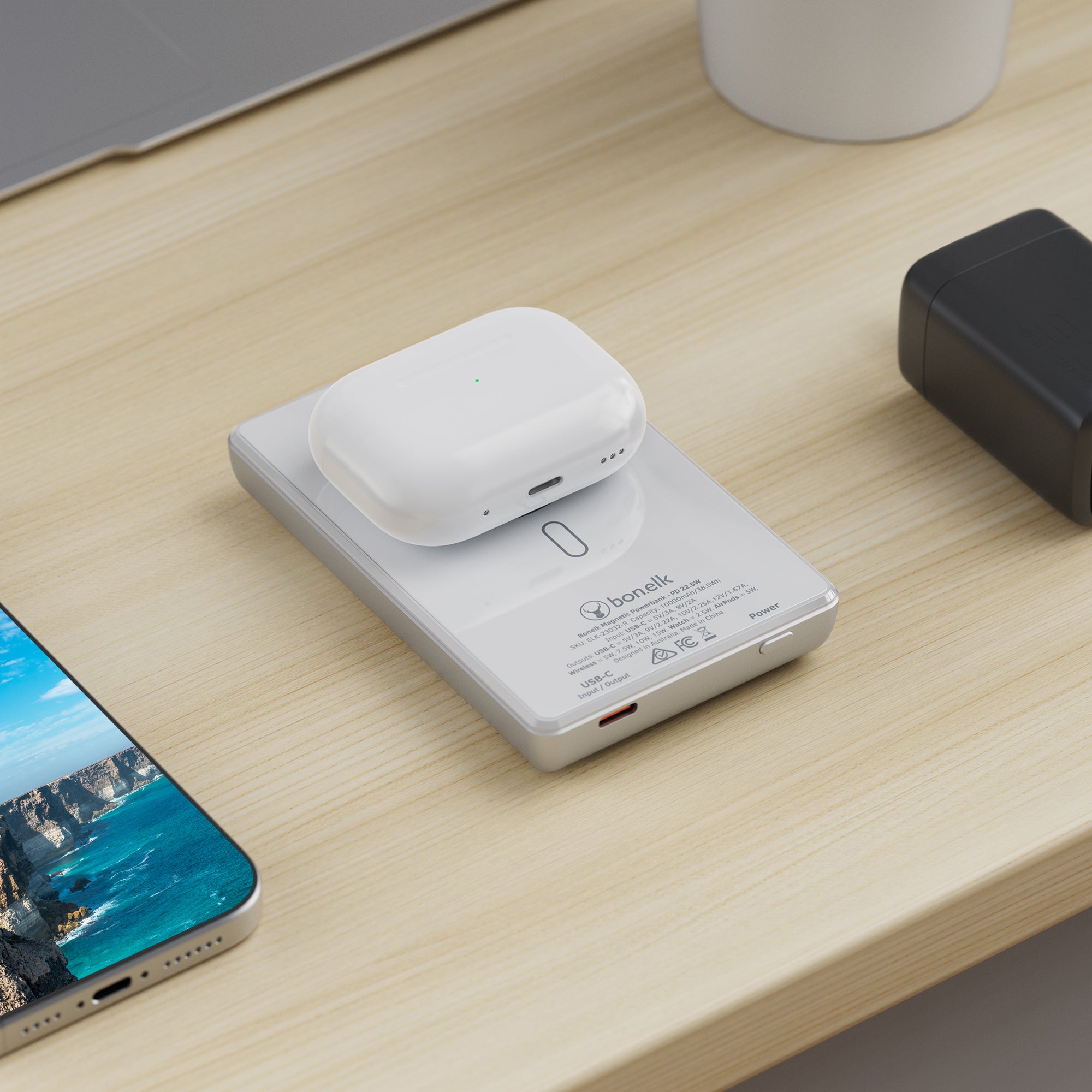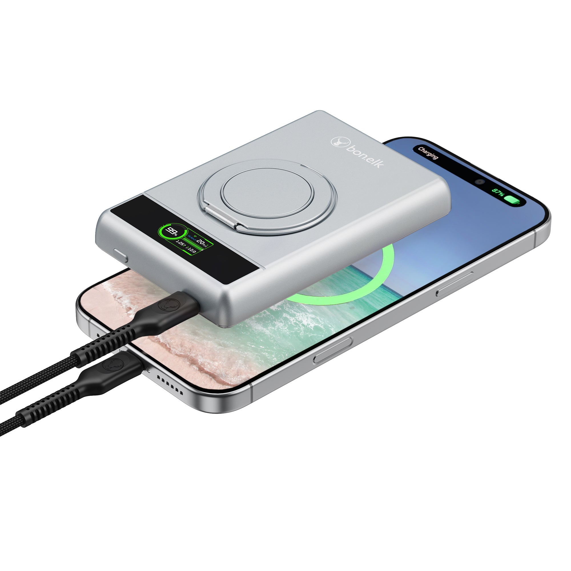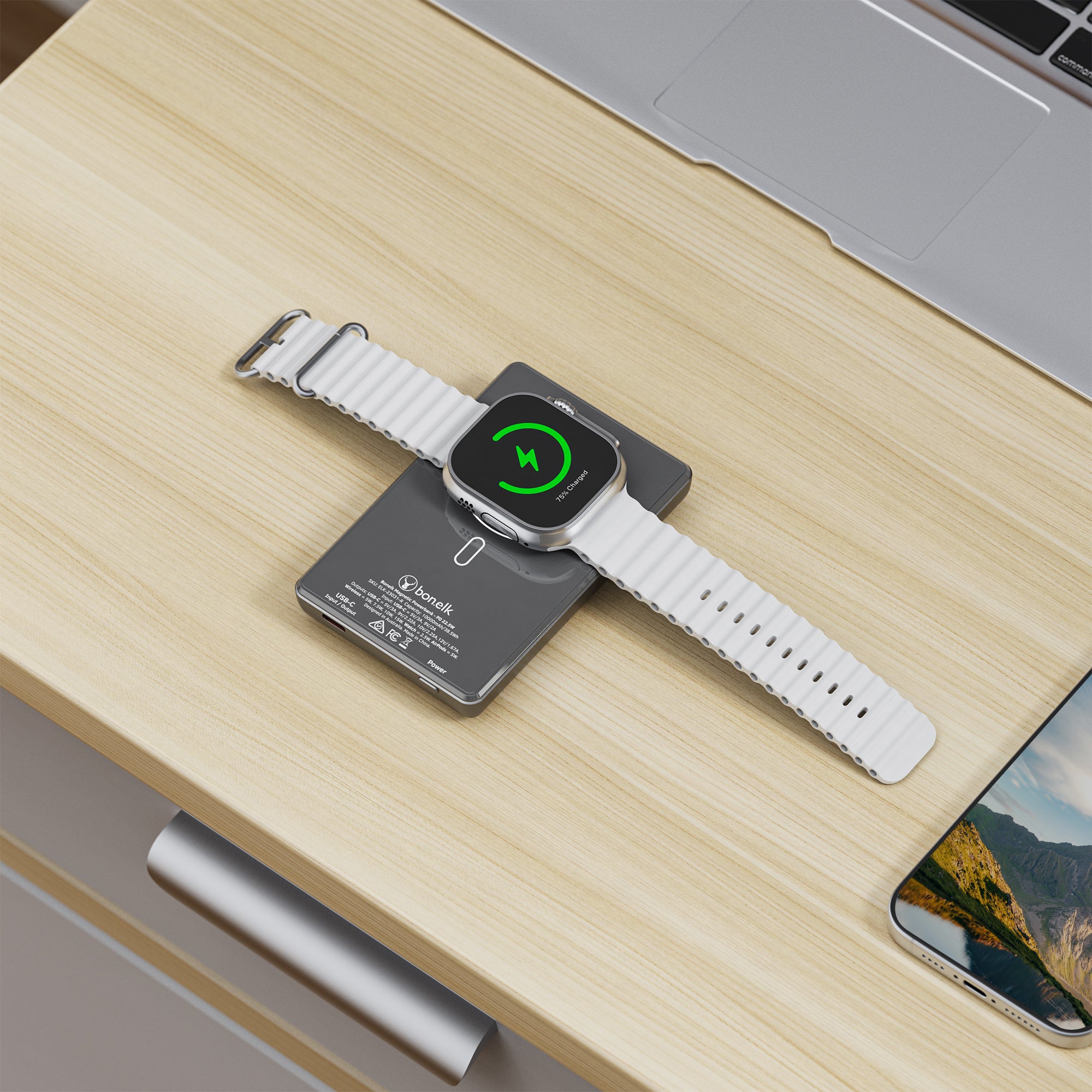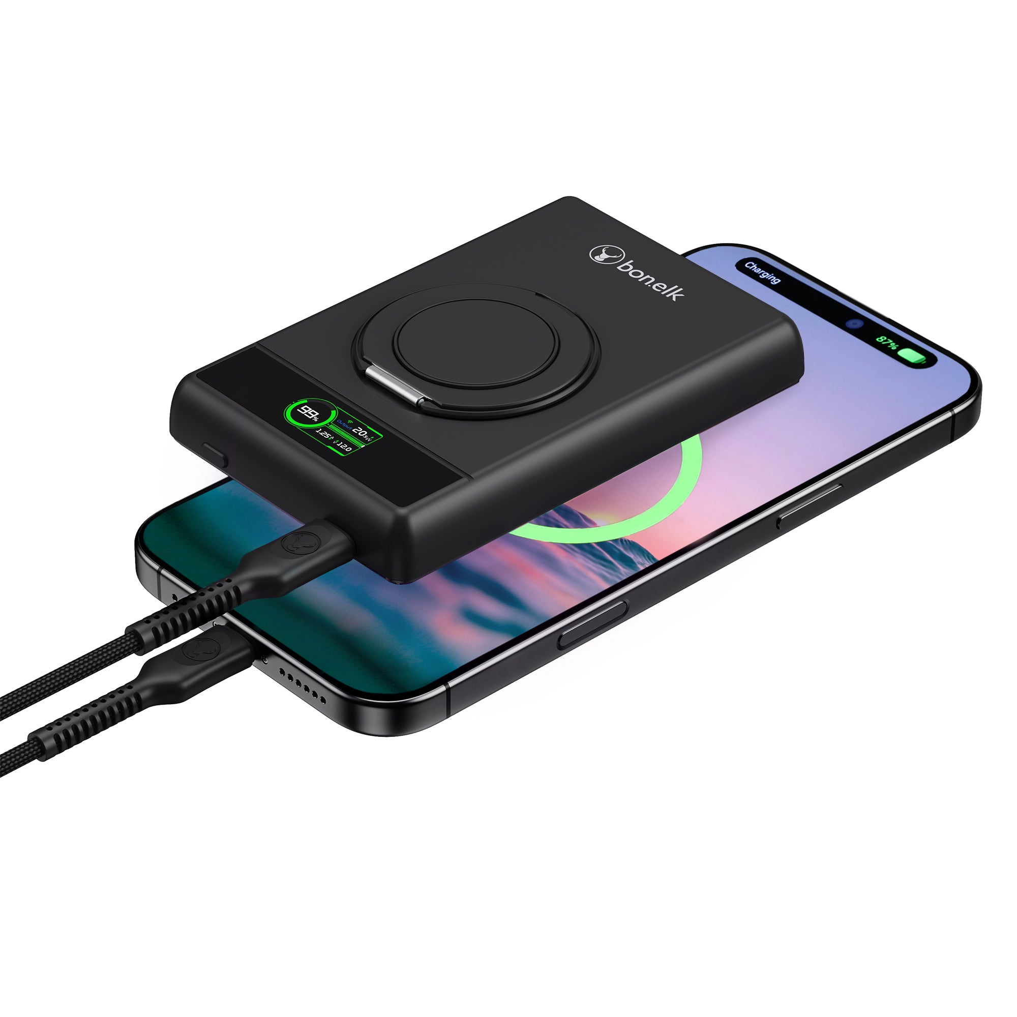 The Bonelk 5-in-1 Magnetic Power Bank delivers portable power with a 10,000 mAh capacity, allowing you to fast charge your iPhone*, Apple Watch, and AirPods anytime, anywhere. Its smart display clearly shows the exact power level and output capacity, while the strong magnetic attachment ensures your devices stay connected for hassle-free charging. Enjoy the convenience of wireless charging, with the added option to charge via the USB-C port using the included USB-C cable.