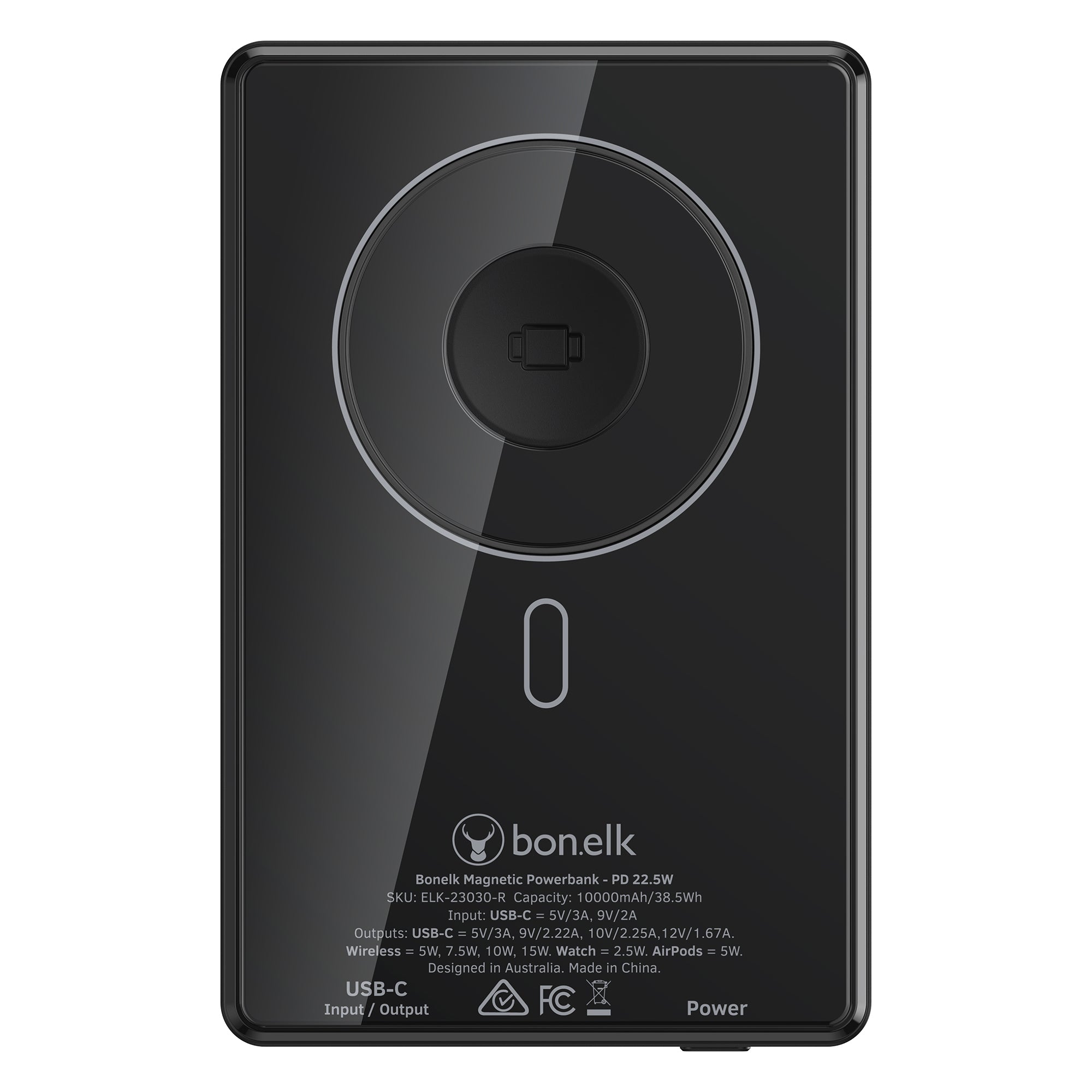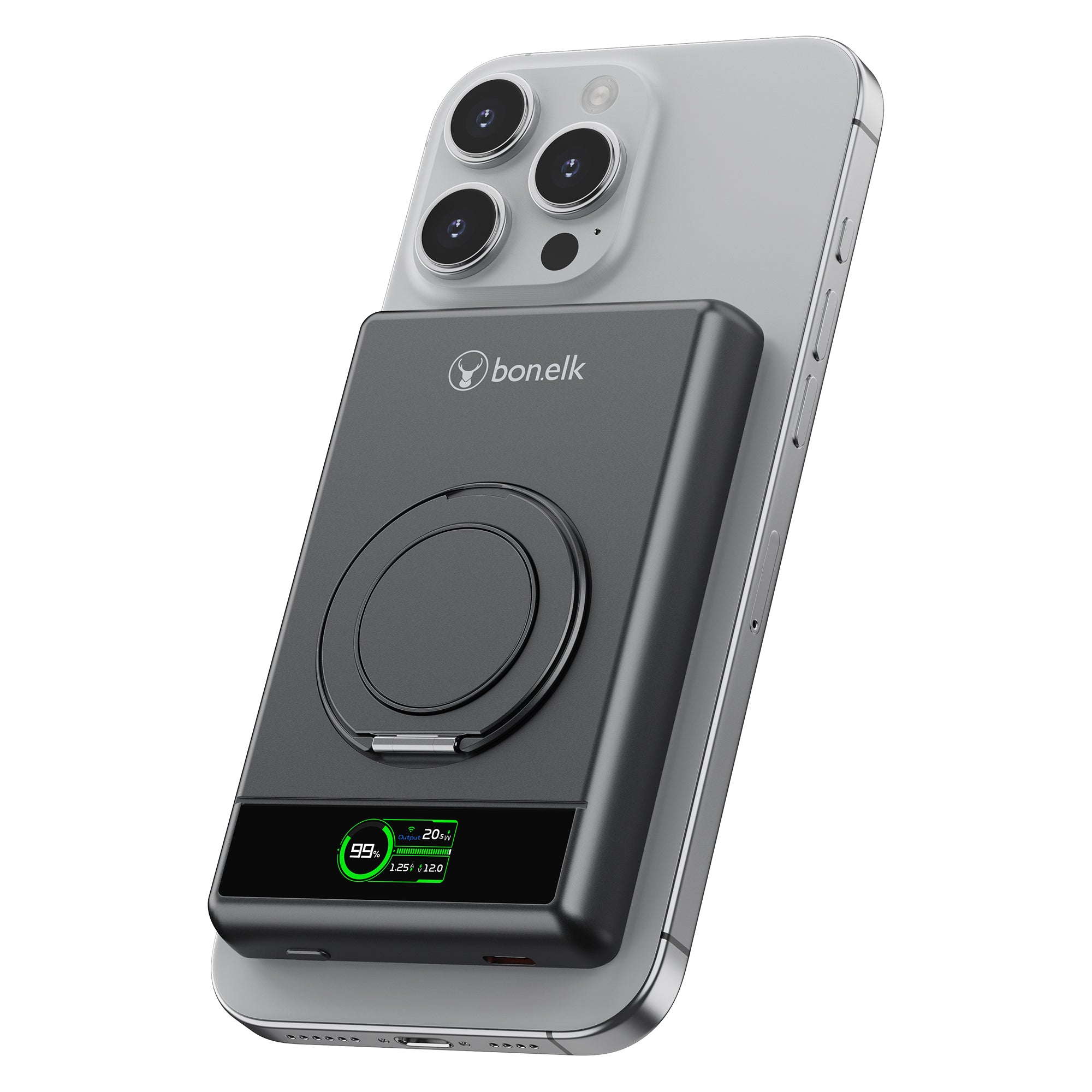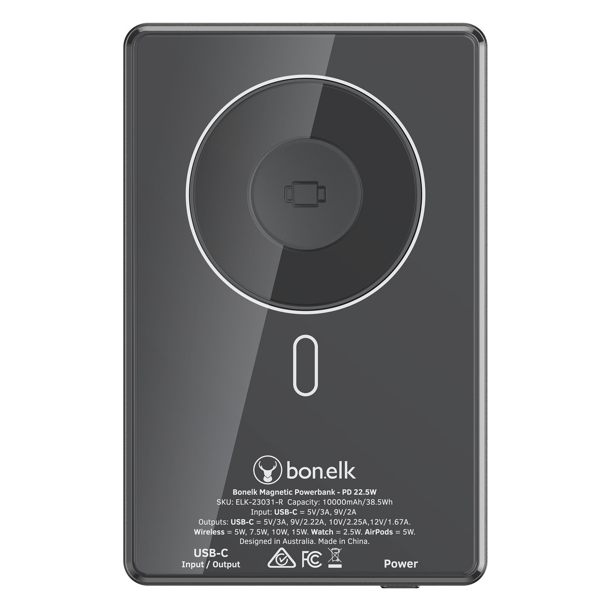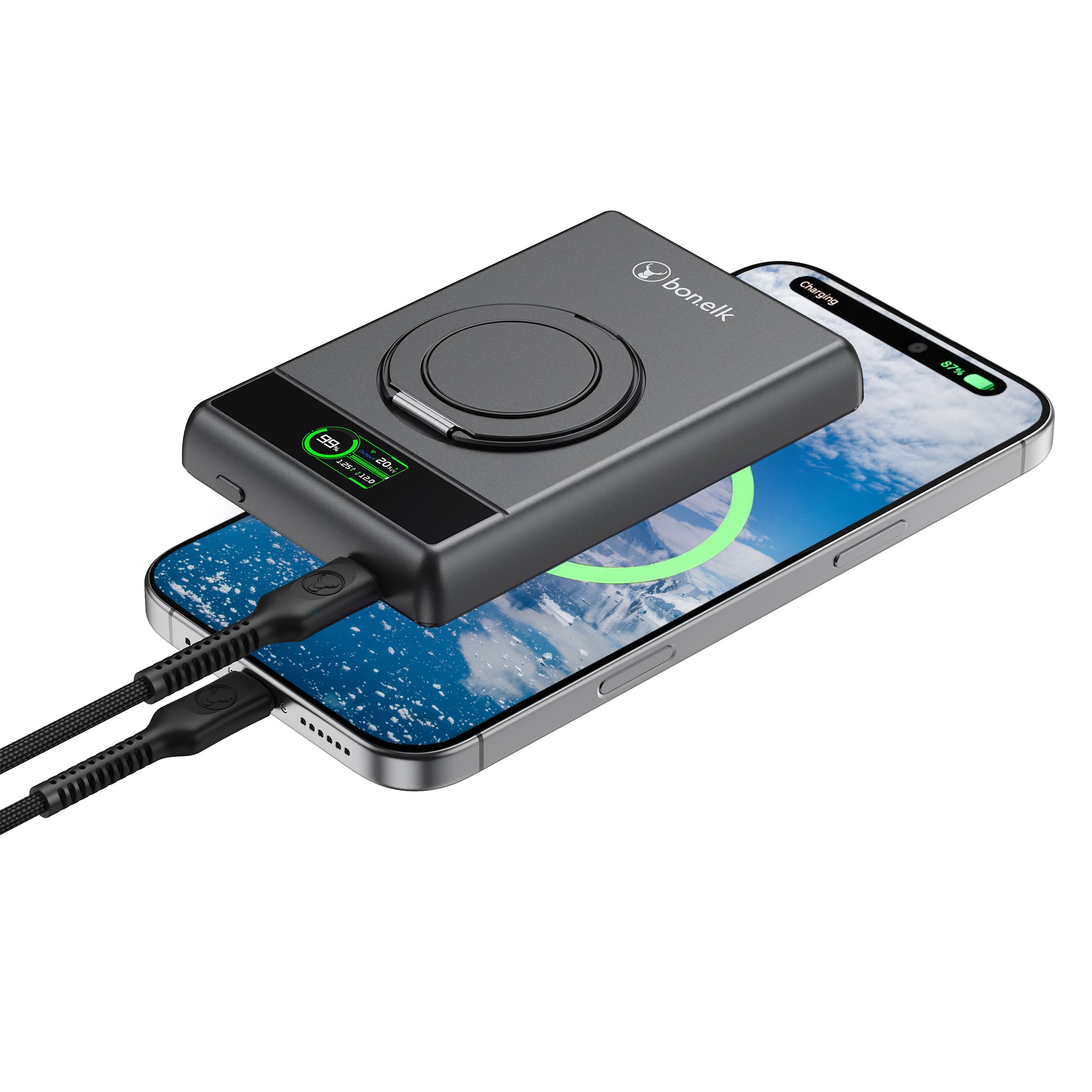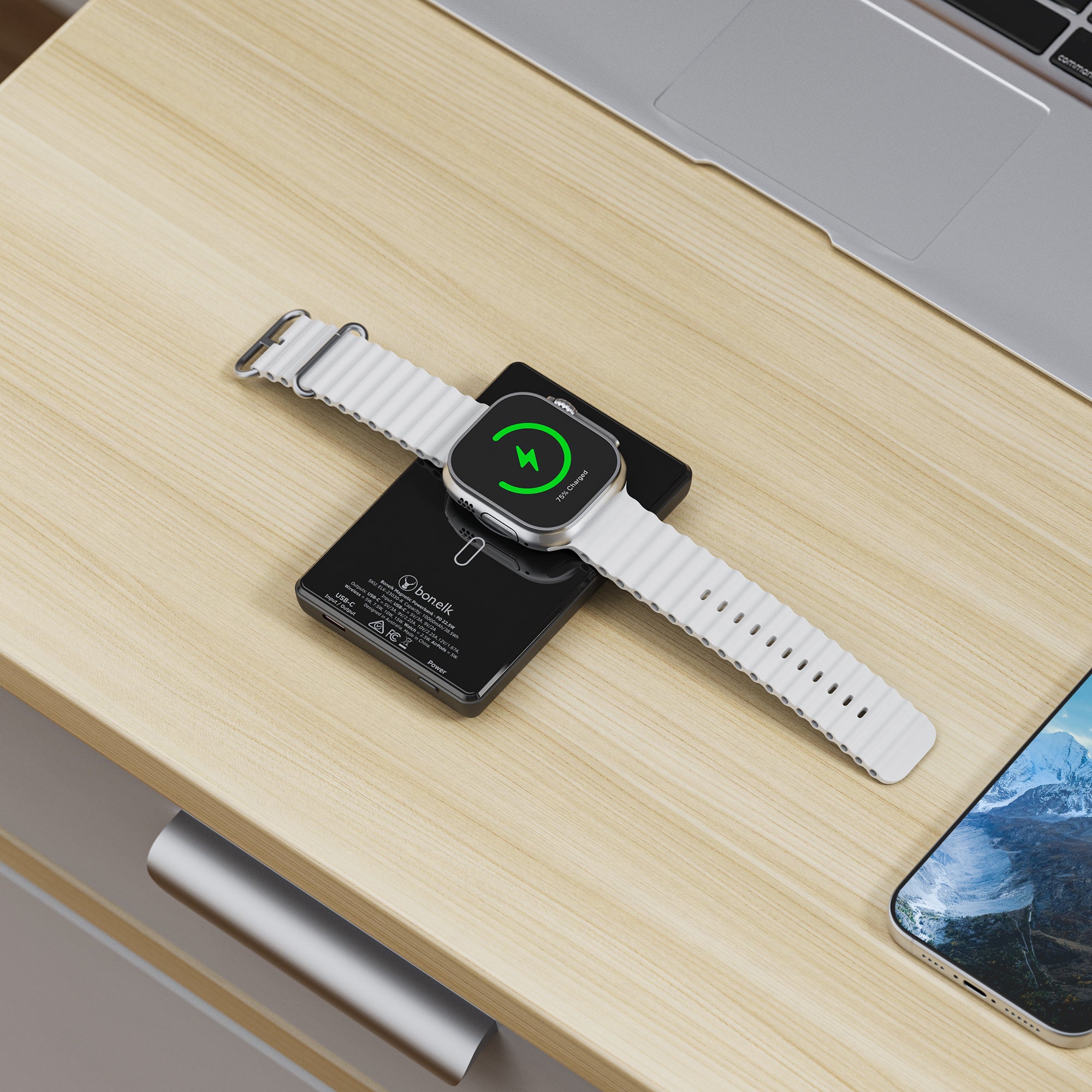 The Bonelk 5-in-1 Magnetic Power Bank delivers portable power with a 10,000 mAh capacity, allowing you to fast charge your iPhone*, Apple Watch, and AirPods anytime, anywhere. Its smart display clearly shows the exact power level and output capacity, while the strong magnetic attachment ensures your devices stay connected for hassle-free charging. Enjoy the convenience of wireless charging, with the added option to charge via the USB-C port using the included USB-C cable.