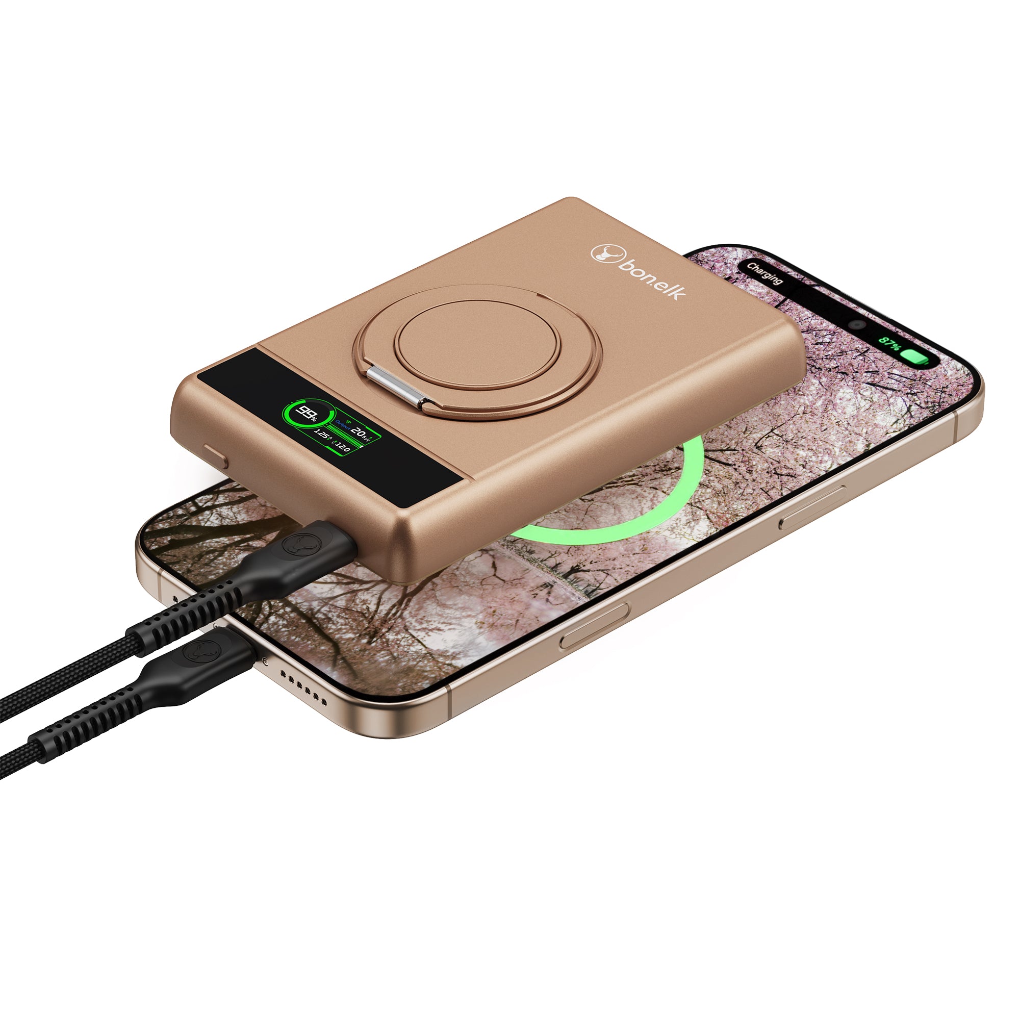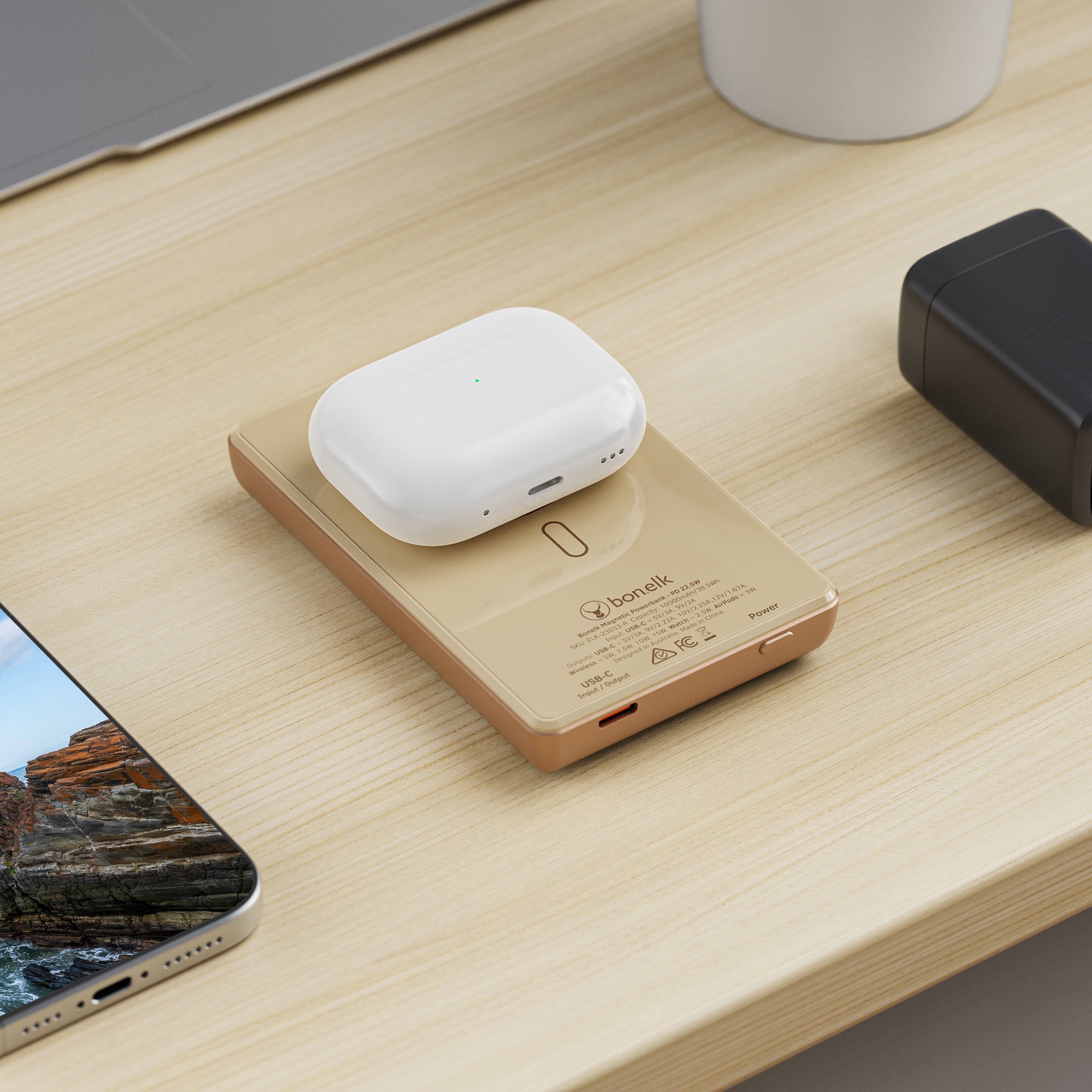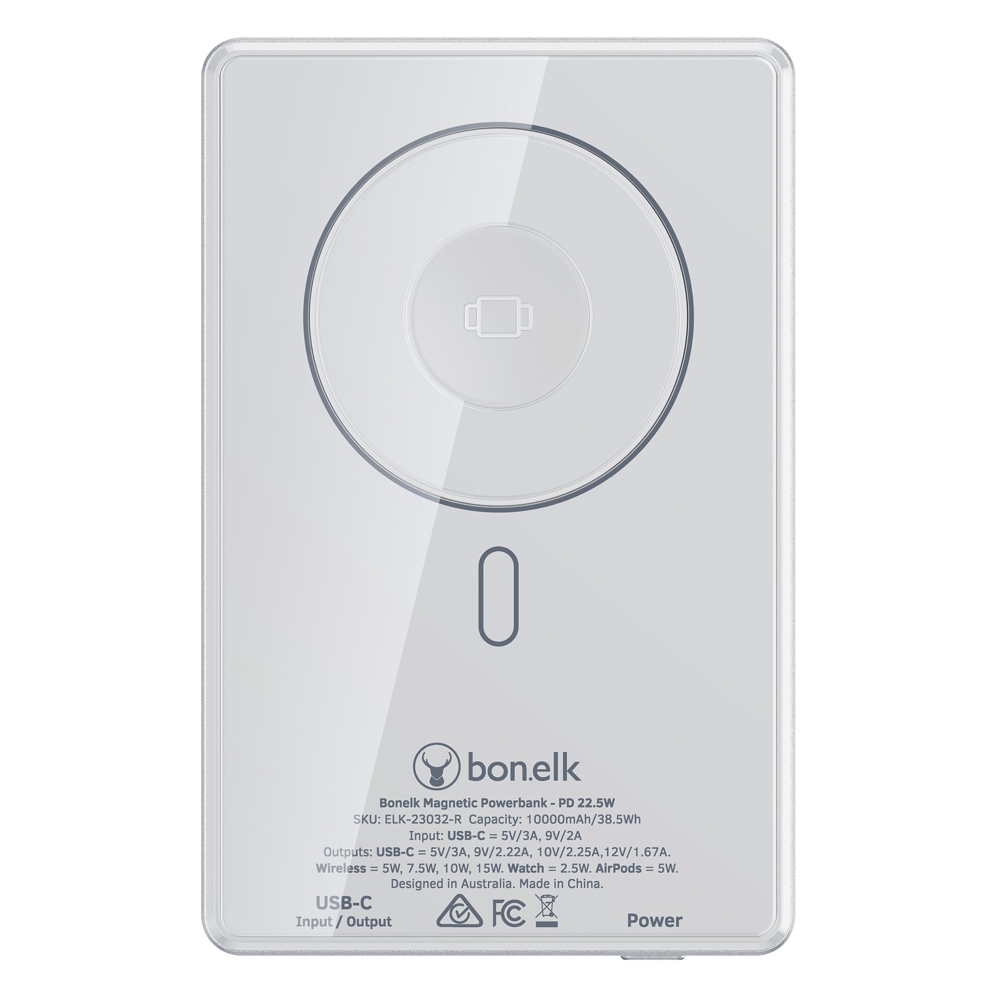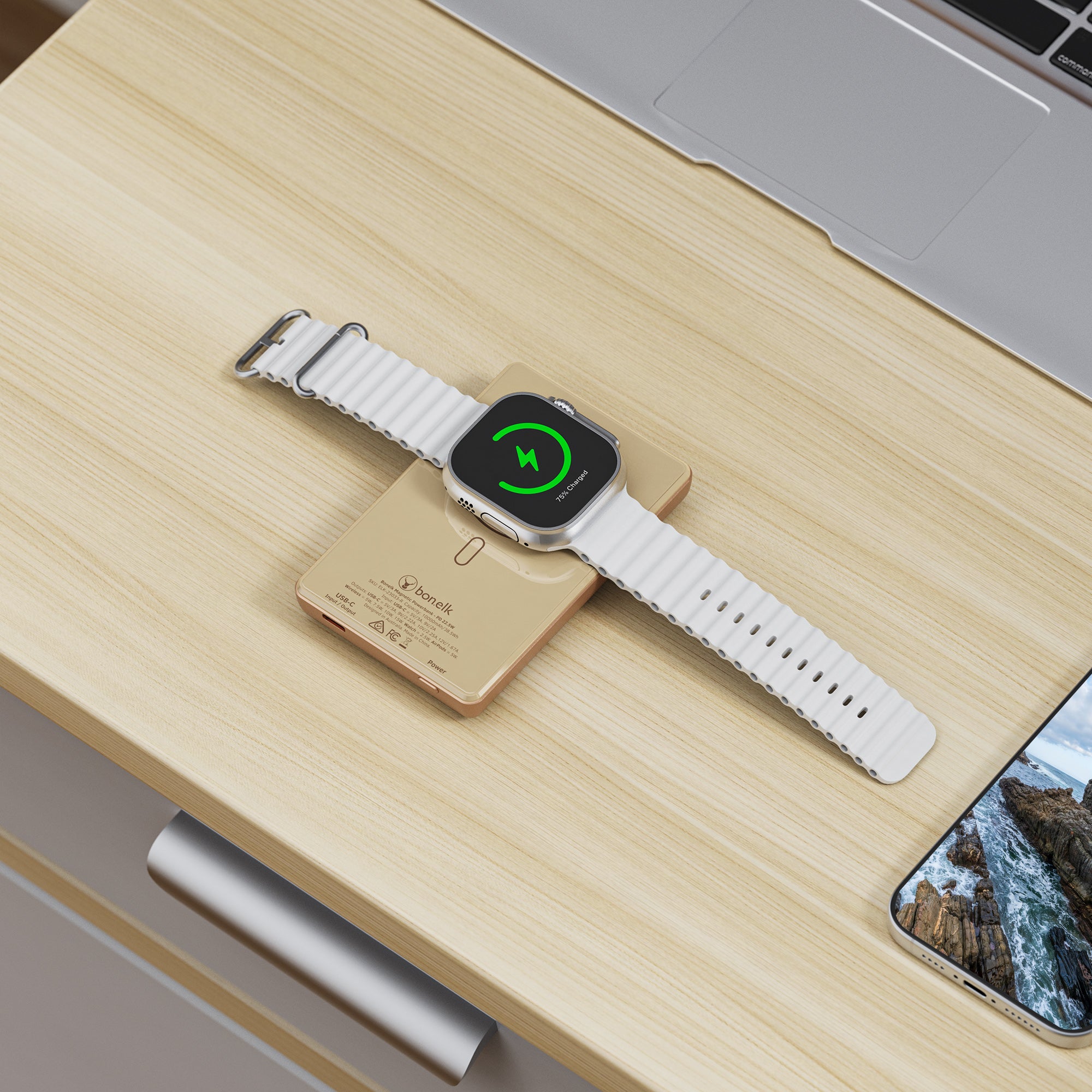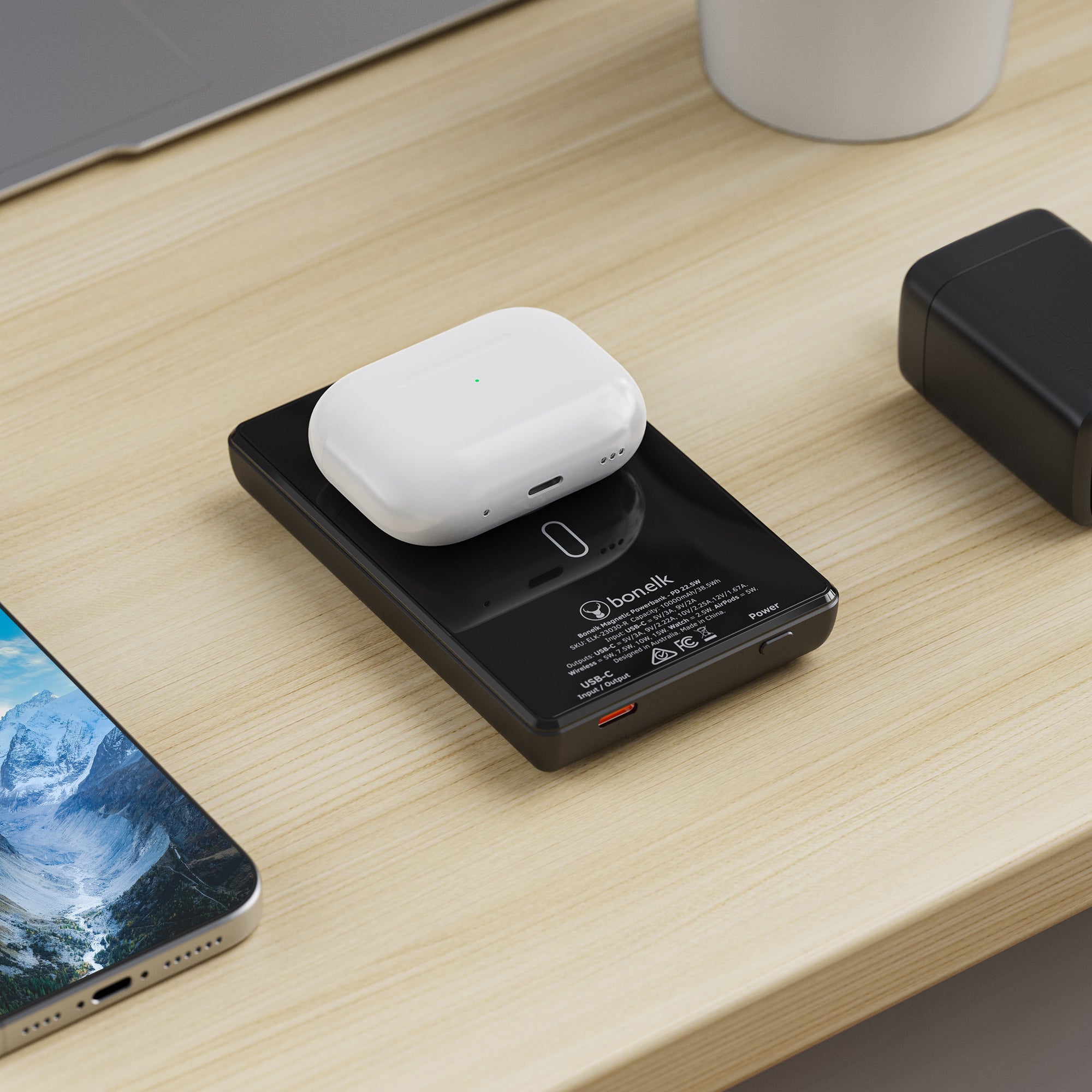 The Bonelk 5-in-1 Magnetic Power Bank delivers portable power with a 10,000 mAh capacity, allowing you to fast charge your iPhone*, Apple Watch, and AirPods anytime, anywhere. Its smart display clearly shows the exact power level and output capacity, while the strong magnetic attachment ensures your devices stay connected for hassle-free charging. Enjoy the convenience of wireless charging, with the added option to charge via the USB-C port using the included USB-C cable.