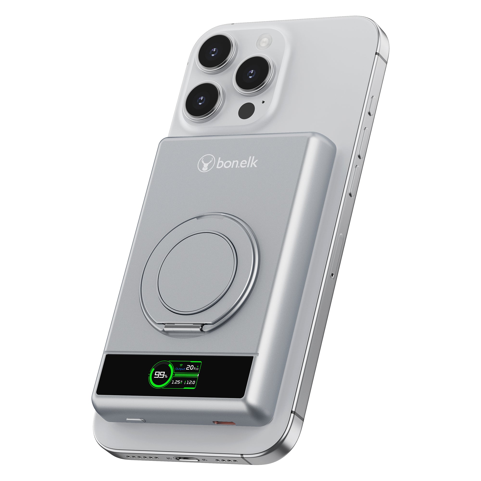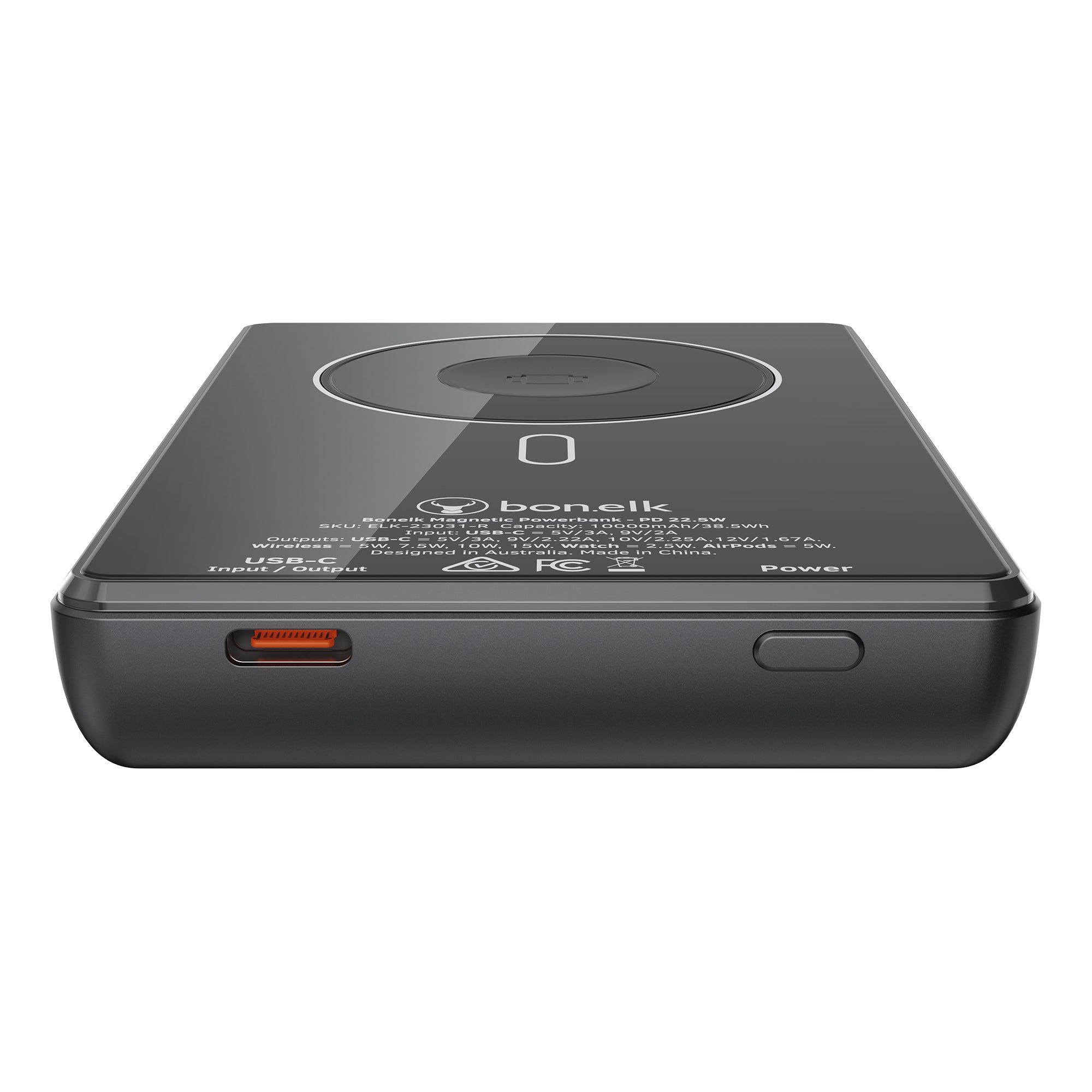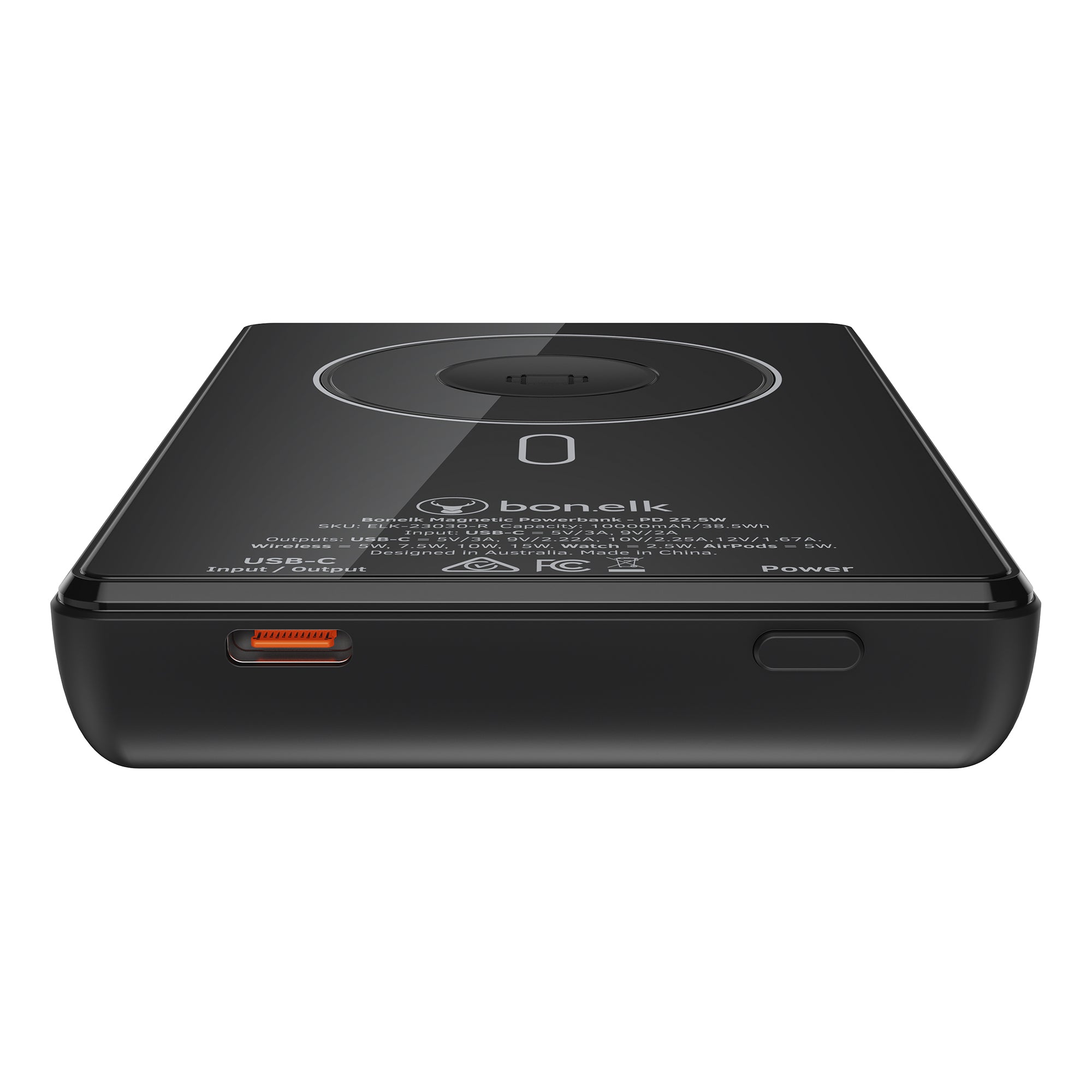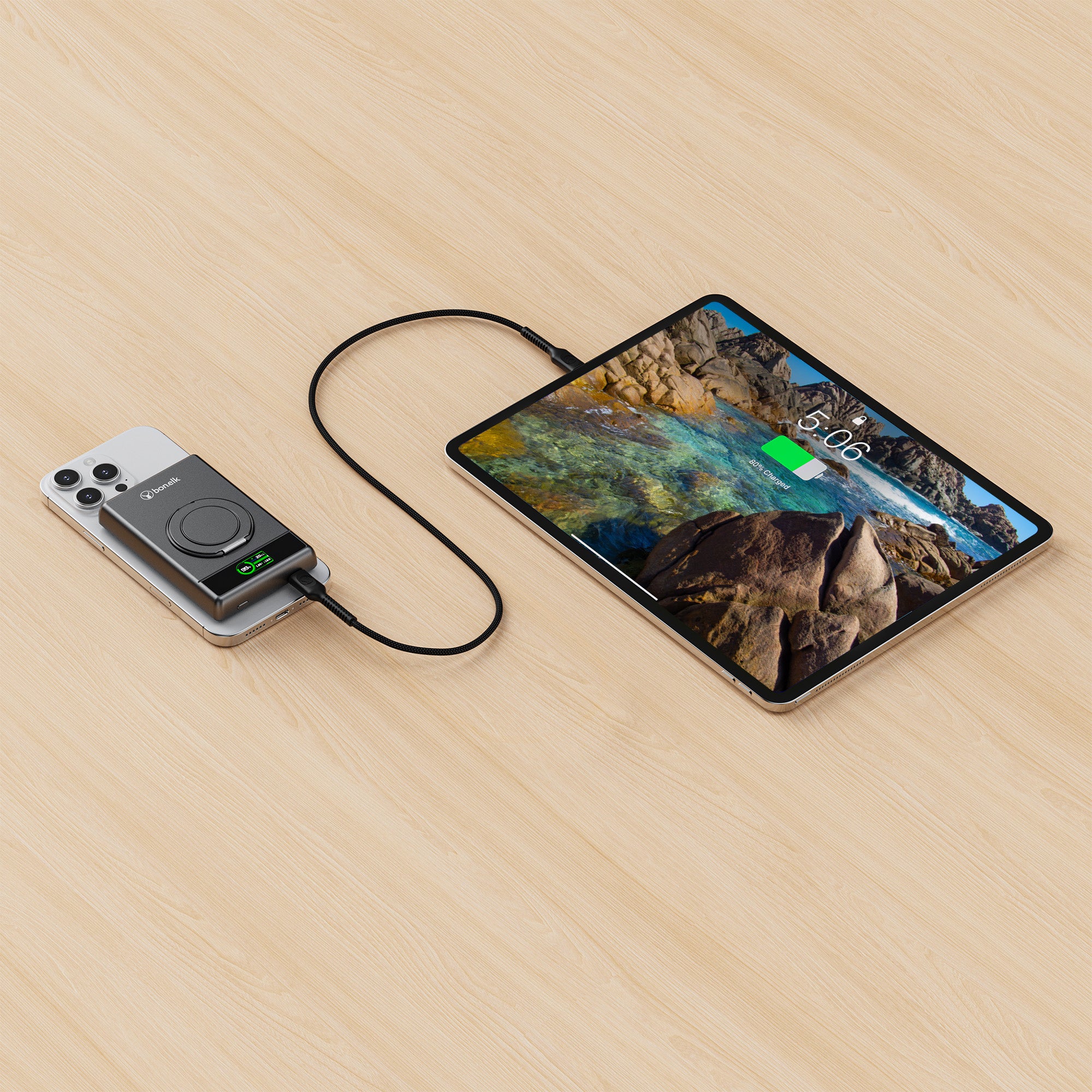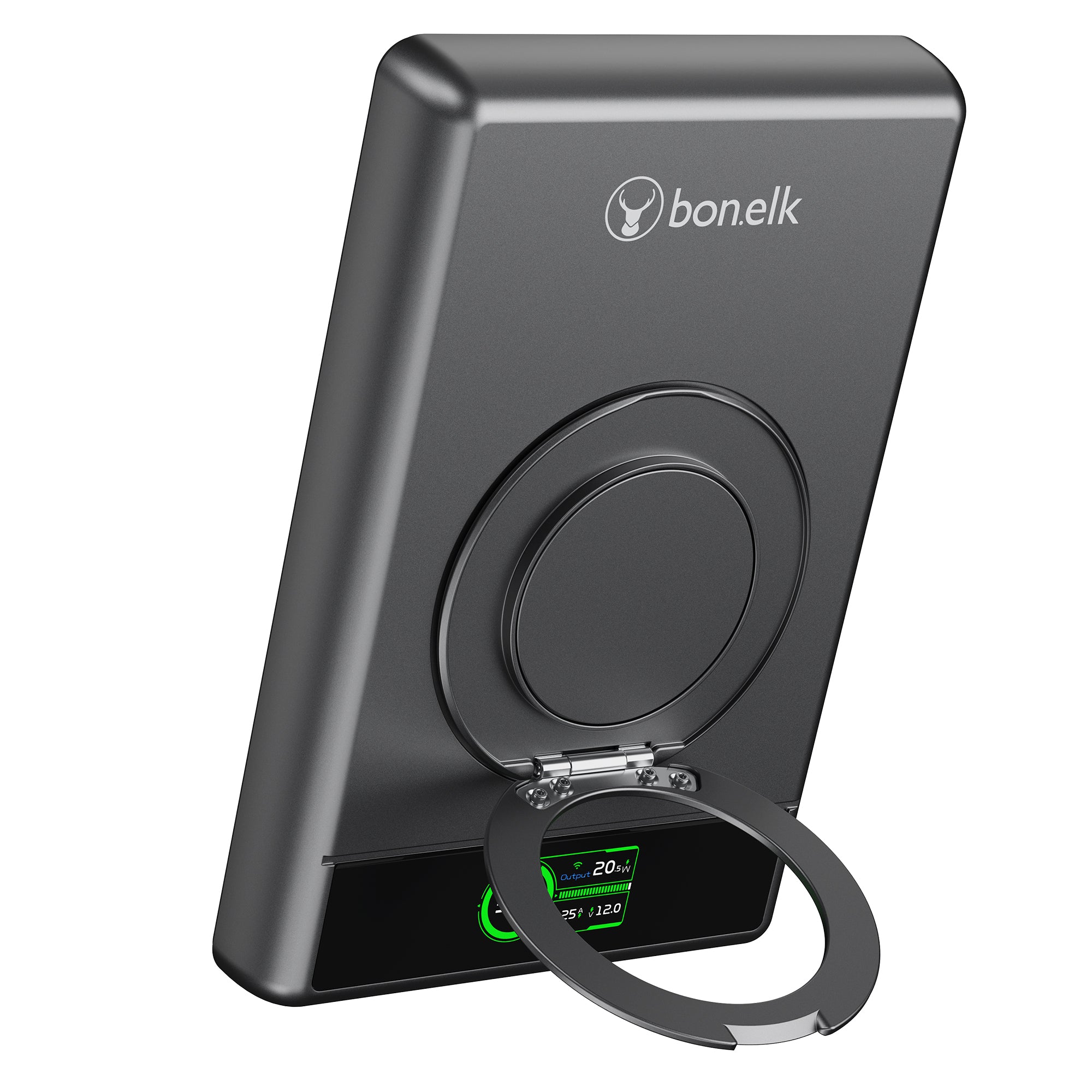 The Bonelk 5-in-1 Magnetic Power Bank delivers portable power with a 10,000 mAh capacity, allowing you to fast charge your iPhone*, Apple Watch, and AirPods anytime, anywhere. Its smart display clearly shows the exact power level and output capacity, while the strong magnetic attachment ensures your devices stay connected for hassle-free charging. Enjoy the convenience of wireless charging, with the added option to charge via the USB-C port using the included USB-C cable.