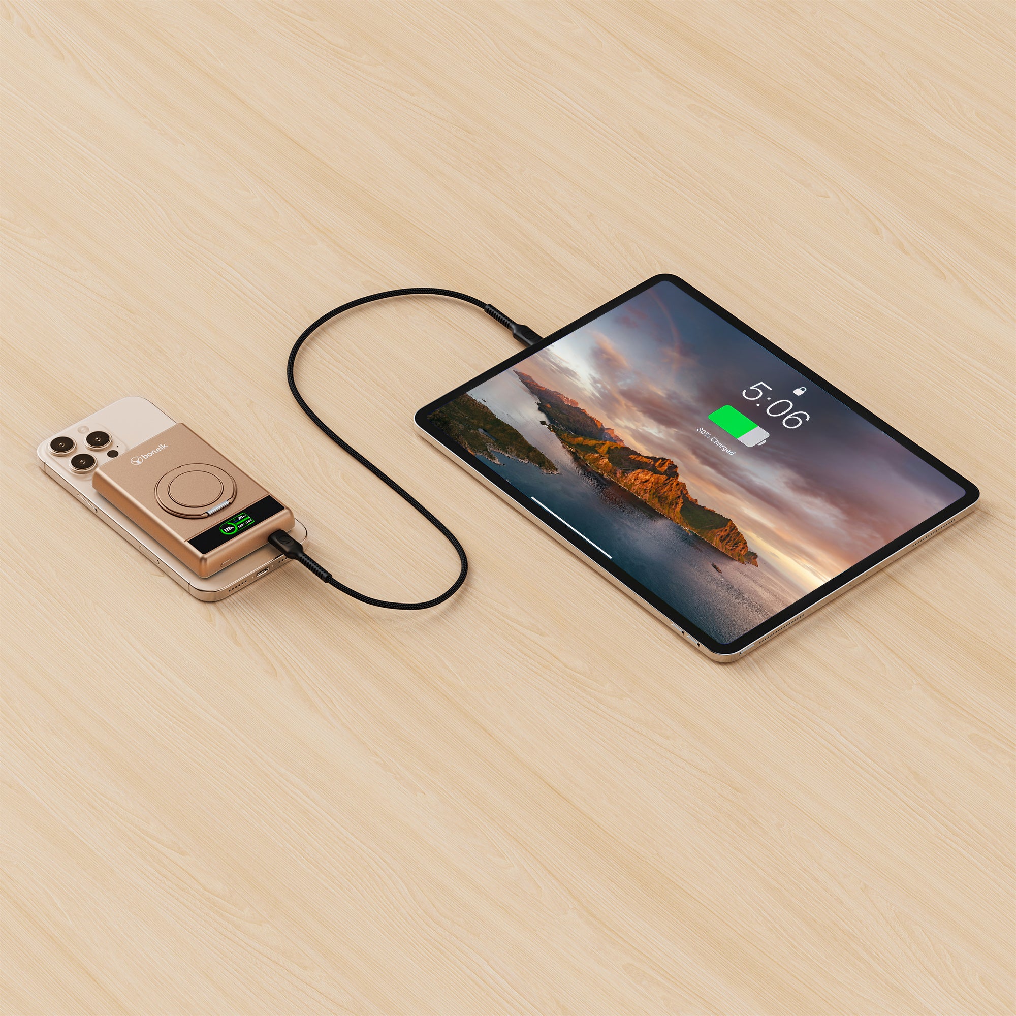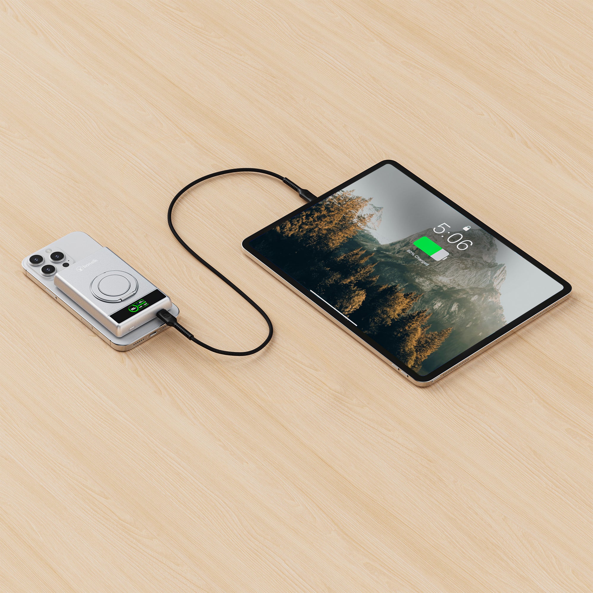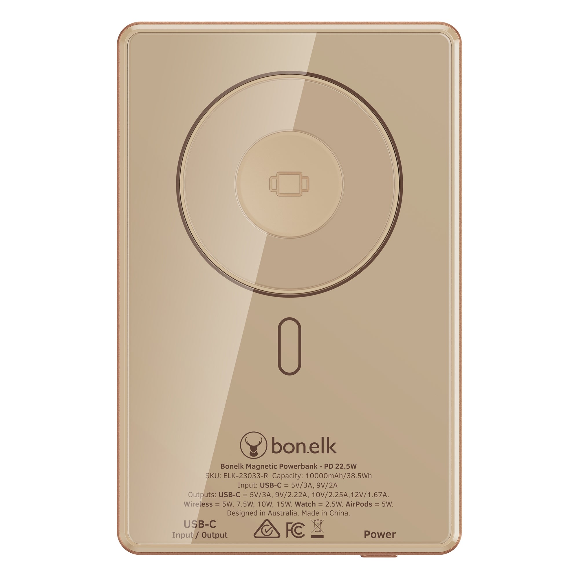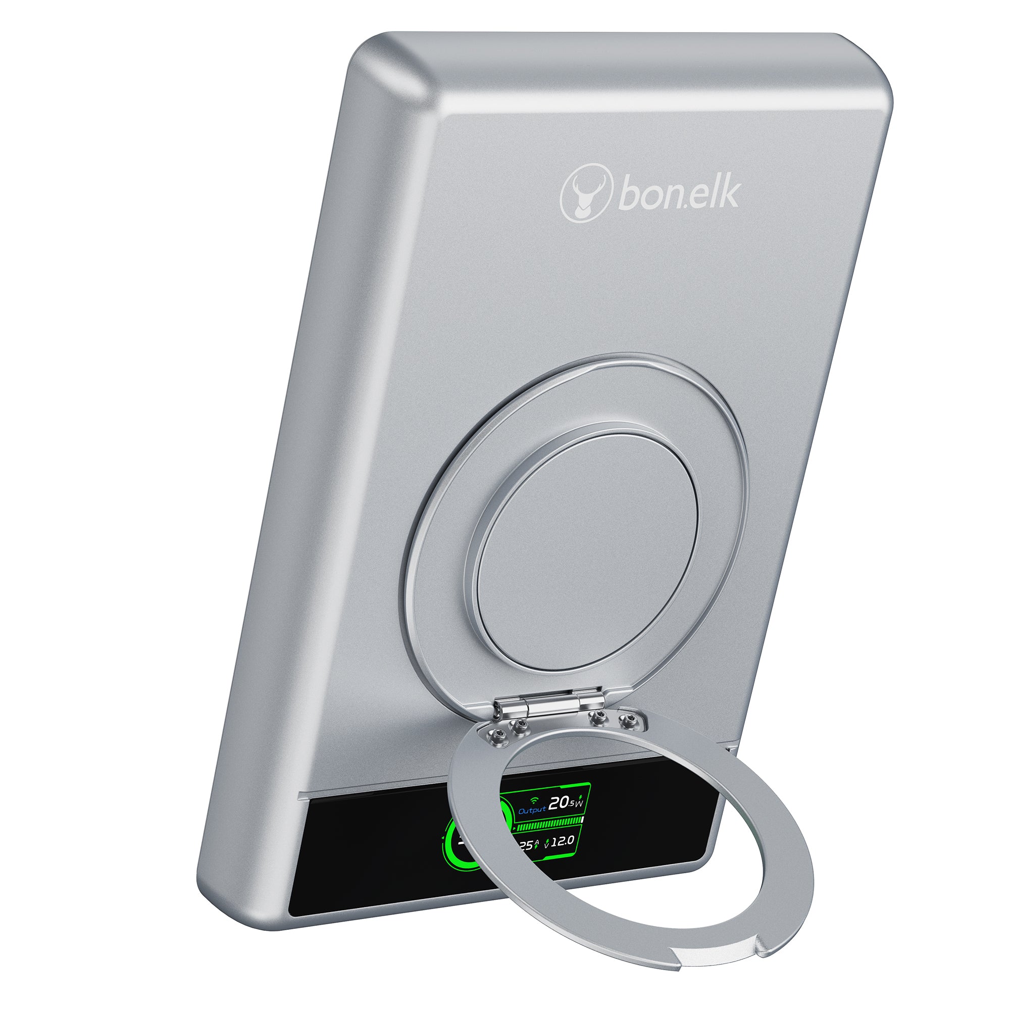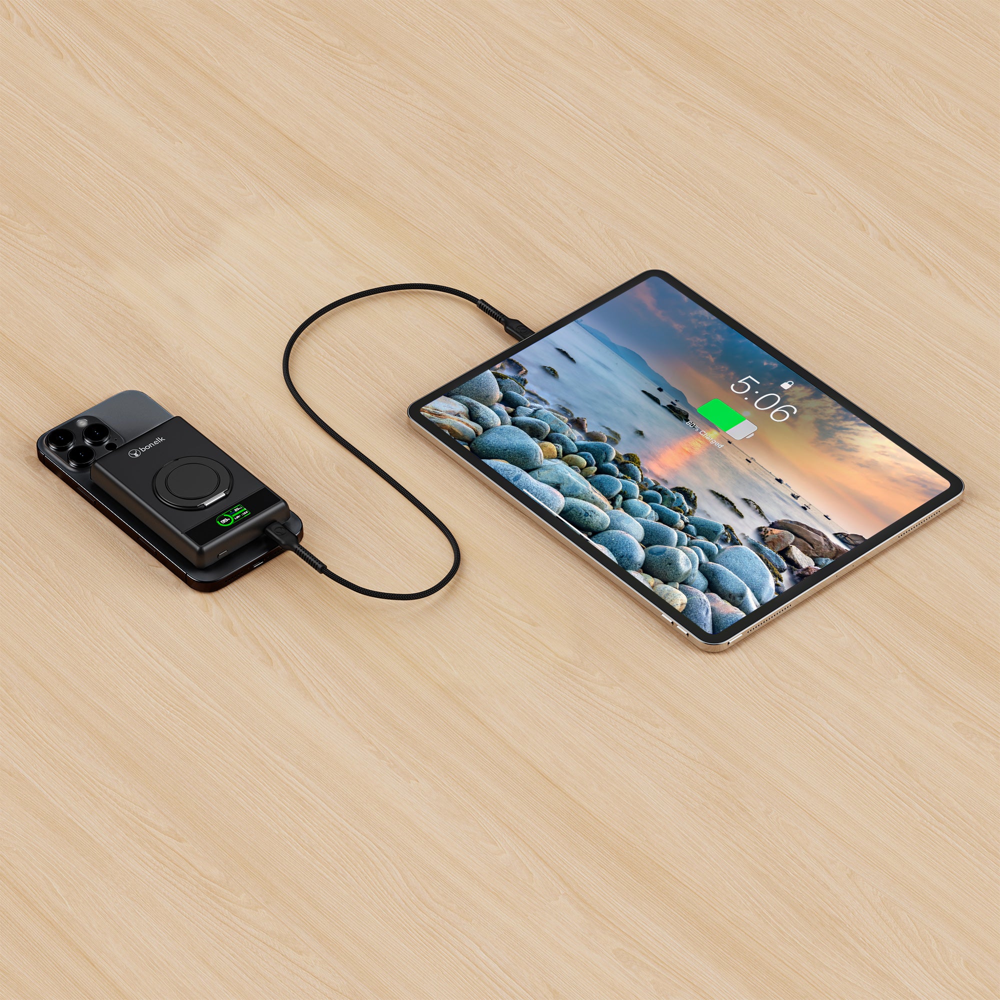 The Bonelk 5-in-1 Magnetic Power Bank delivers portable power with a 10,000 mAh capacity, allowing you to fast charge your iPhone*, Apple Watch, and AirPods anytime, anywhere. Its smart display clearly shows the exact power level and output capacity, while the strong magnetic attachment ensures your devices stay connected for hassle-free charging. Enjoy the convenience of wireless charging, with the added option to charge via the USB-C port using the included USB-C cable.