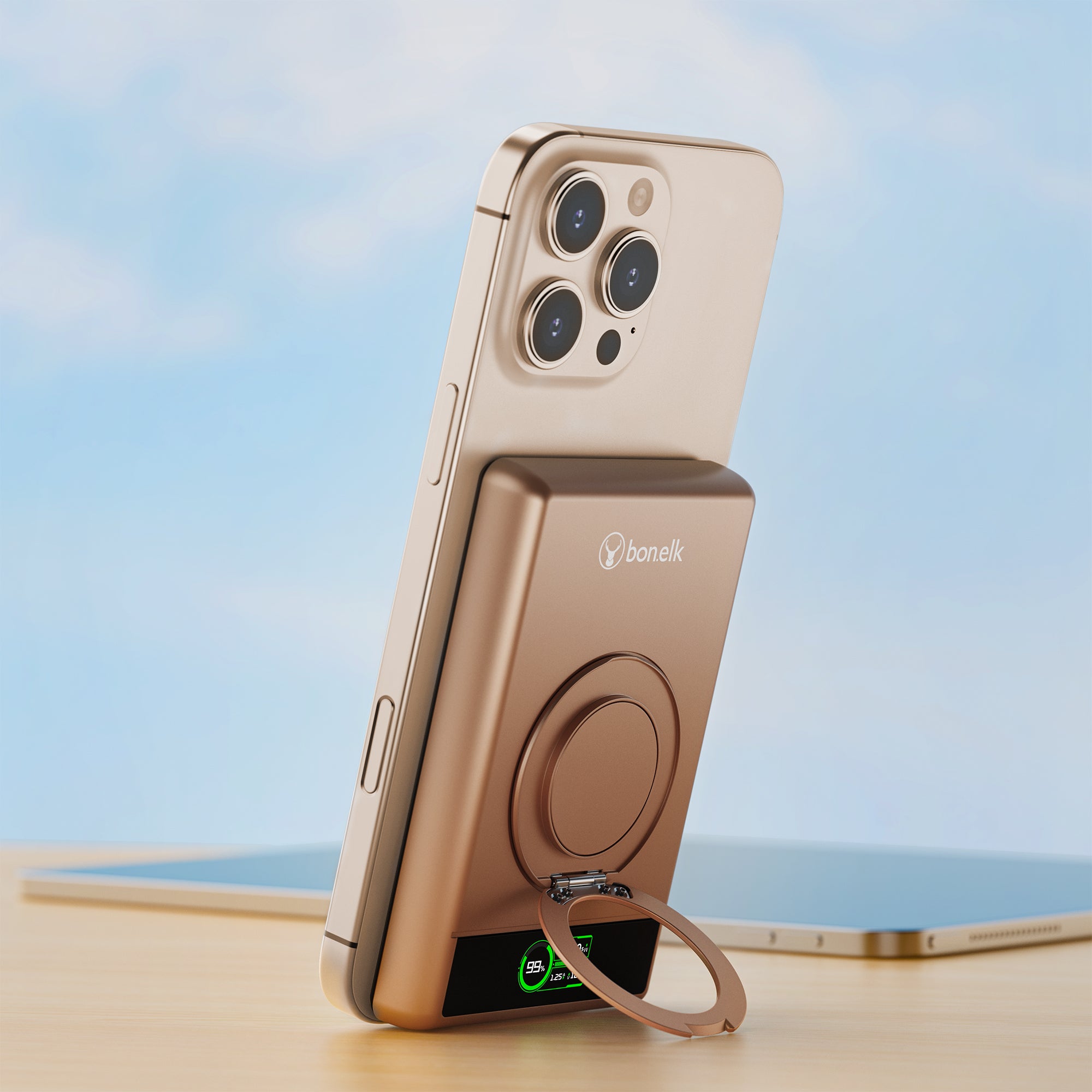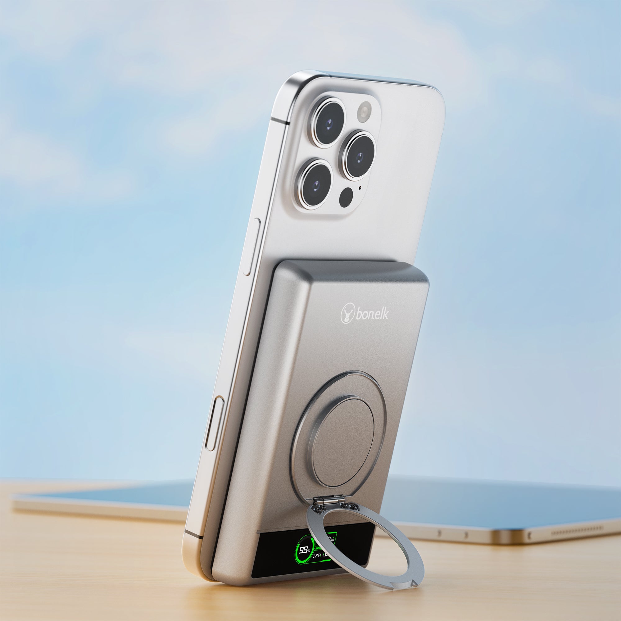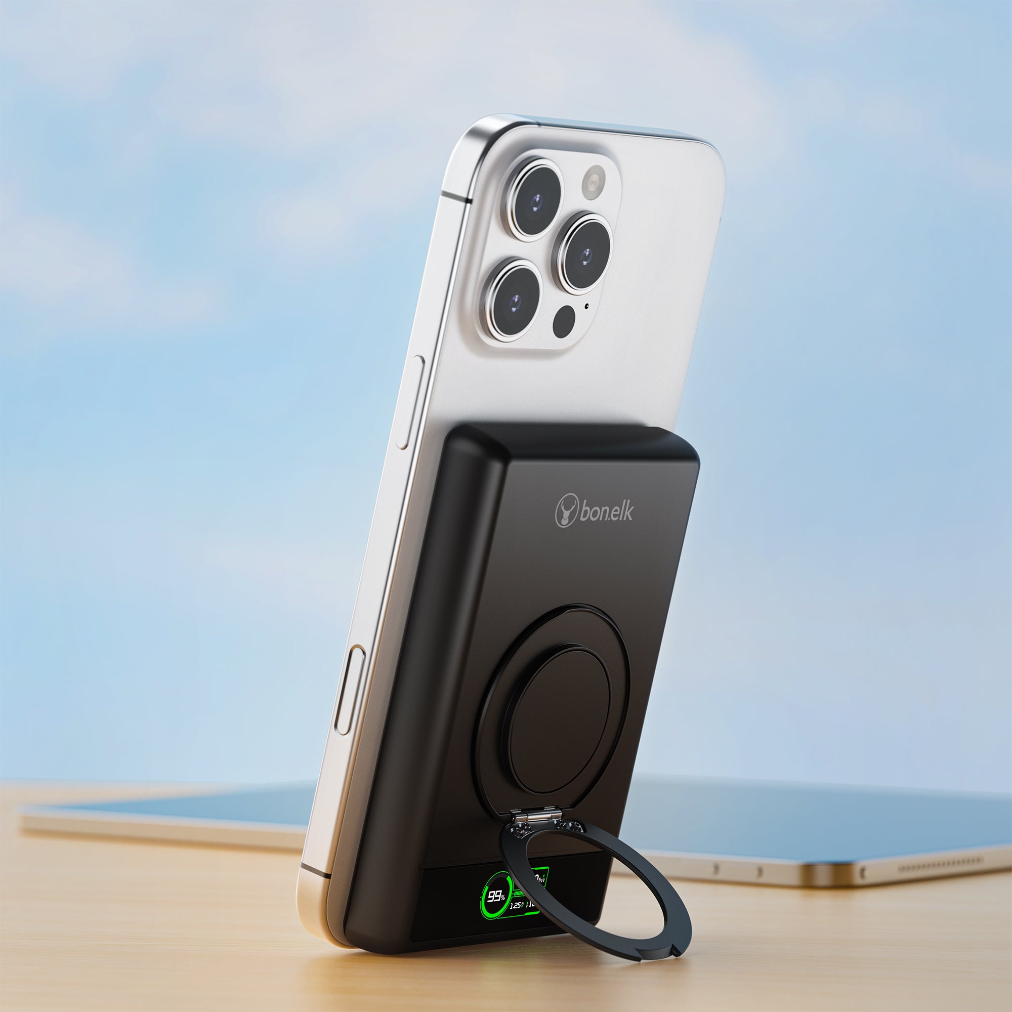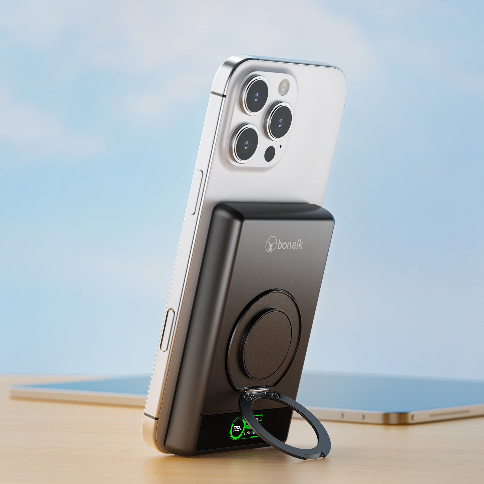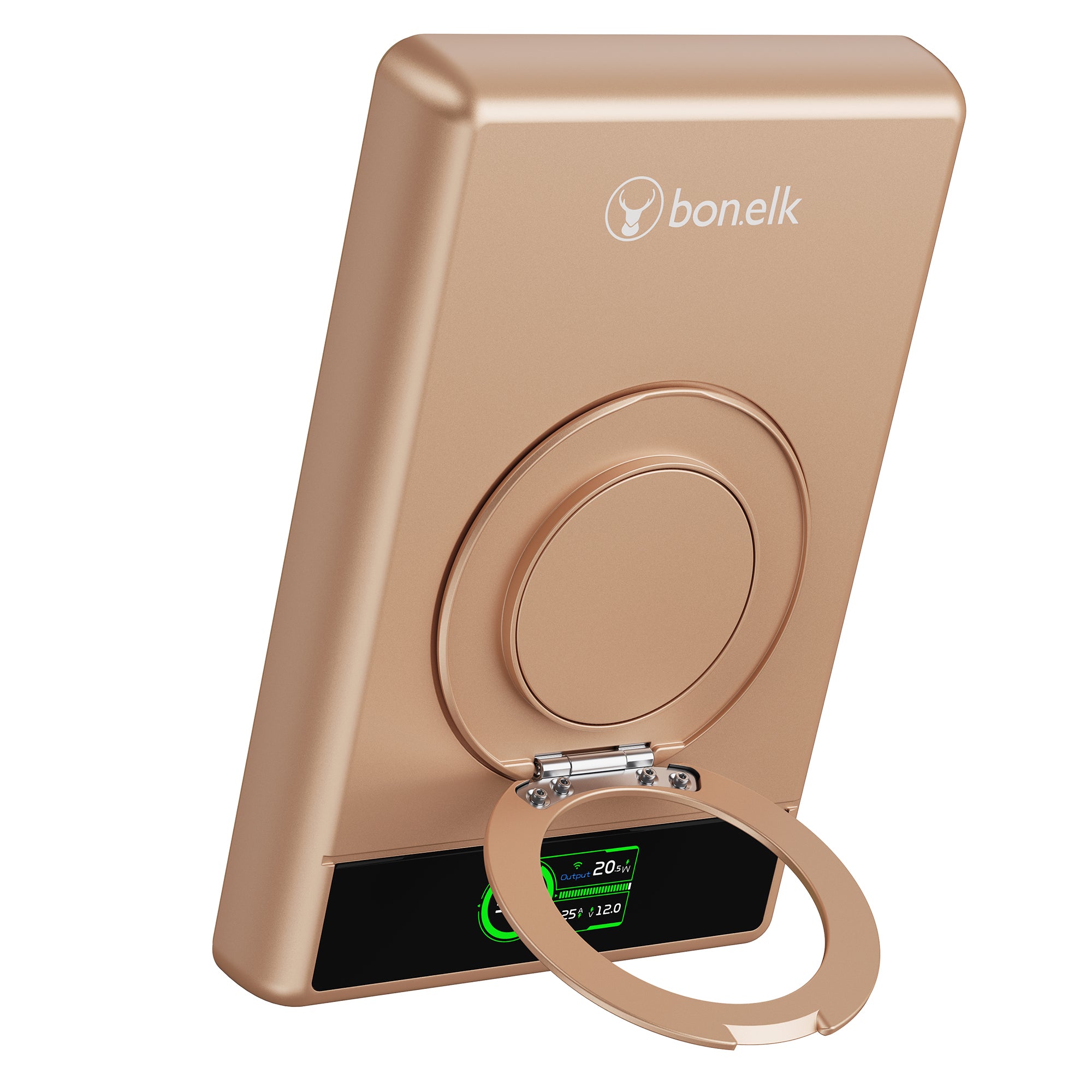 The Bonelk 5-in-1 Magnetic Power Bank delivers portable power with a 10,000 mAh capacity, allowing you to fast charge your iPhone*, Apple Watch, and AirPods anytime, anywhere. Its smart display clearly shows the exact power level and output capacity, while the strong magnetic attachment ensures your devices stay connected for hassle-free charging. Enjoy the convenience of wireless charging, with the added option to charge via the USB-C port using the included USB-C cable.